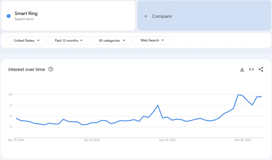 Look at the chart above. This is the search volume for "Samsung Ring" over the last 90 days. You see that massive spike in November? That is Samsung spending millions of dollars to educate your future customers. The Insight: The public now knows what a Smart Ring is. But most consumers are not willing to pay $399. The search trend is stabilizing, which means the "Hype Phase" is over and the "Buying Phase" for affordable options ($50-$80) is beginning.