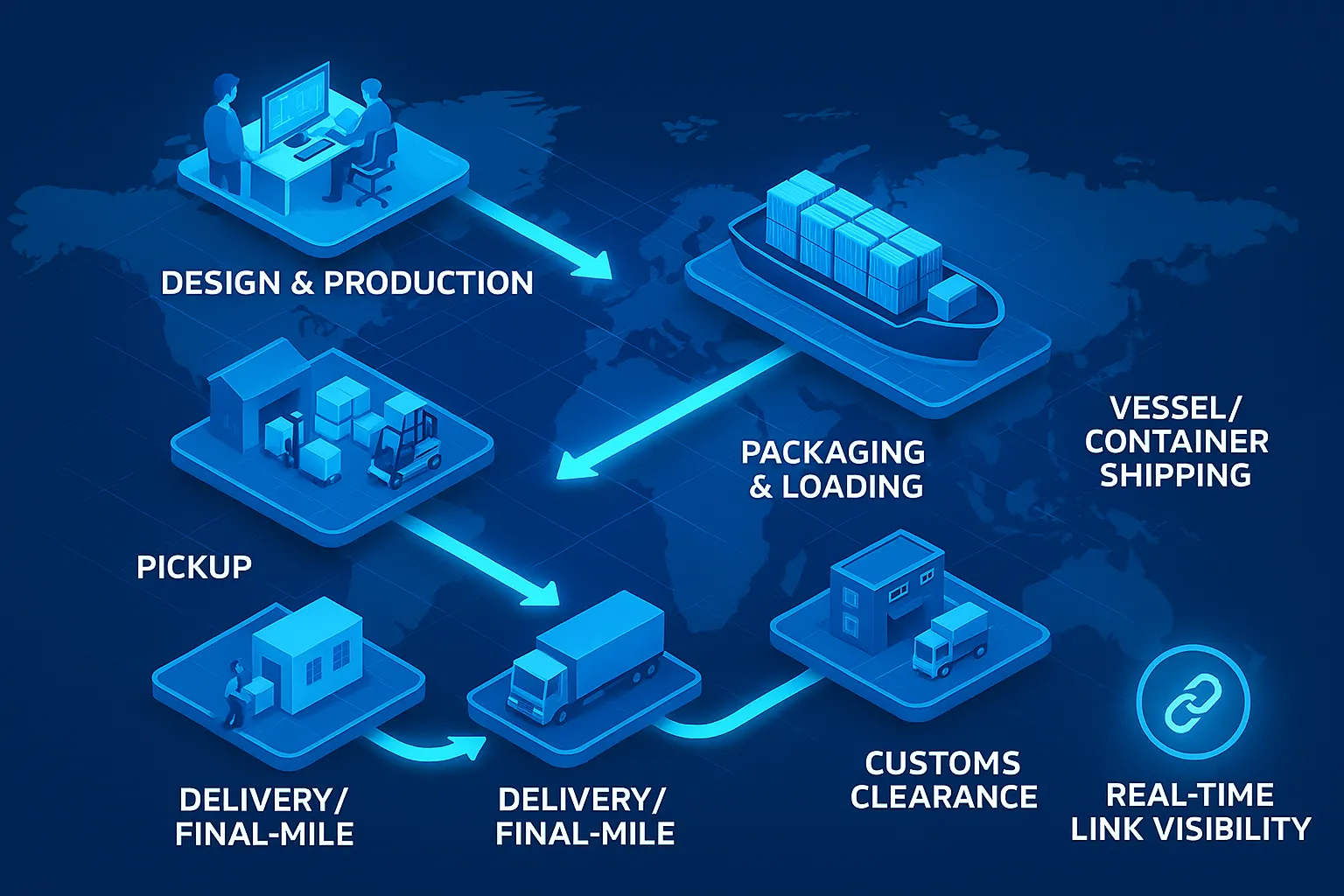 Each stage of the supply chain is fully visible: design & production → packaging & loading → vessel/container shipping → customs clearance / pickup / delivery / final-mile → real-time link visibility. You can monitor the entire process at a glance.